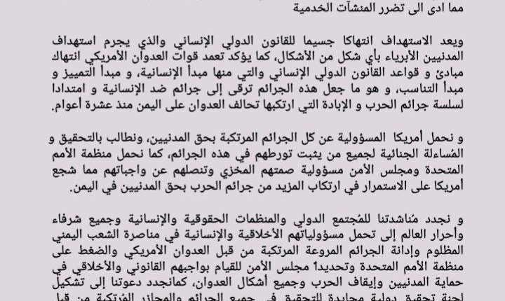 و نحمل أمريكا المسؤولية عن كُل الجرائم المرتكبة بحق المدنيين، ونطالب بالتحقيق والمُساءلة الجنائية لجميع من يثبت تورطهم في هذه الجرائم، كما نحمل منظمة الأمم المتحدة ومجلس الأمن مسؤولية صمتهم المخزي وتنصلهم عن واجباتهم مما شجع أمريكا على الاستمرار في ارتكاب المزيد من جرائم الحرب بحق المدنيين في اليمن.