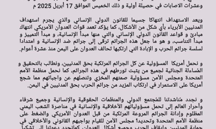 و نجدد مُناشدتنا للمُجتمع الدولي والمنظمات الحقوقية والإنسانية وجميع شرفاء وأحرار العالم إلى تحمل مسؤولياتهم الأخلاقية والإنسانية في مناصرة الشعب اليمني المظلوم وإدانة الجرائم المروعة المرتكبة من قبل العدوان الأمريكي والضغط على منظمة الأمم المتحدة وتحديداً مجلس الأمن للقيام بواجبهم القانوني والأخلاقي في حماية المدنيين وإيقاف الحرب وجميع أشكال العدوان، كمانجدد دعوتنا إلى تشكيل لجنة تحقيق دولية محايدة للتحقيق في جميع الجرائم والمجازر المُرتكبة من قبل القوات الأمريكية بحق المدنيين العزل.
