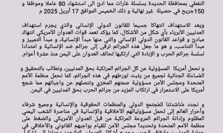 ندين ونستنكر بأشد العبارات استمرار جرائم العدوان الأمريكي بحق الشعب اليمني من خلال قصفه المتعمد للمدنيين والأعيان المدنية، حيث قام بقصف ميناء رأس عيسى النفطي بمحافظة الحديدة بسلسلة غارات مما ادئ الى استشهاد 80 عاملا وموظفا و 150 جريحا في حصيلة غير نهائية و ذلك الخميس الموافق 17 أبريل 2025م