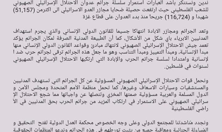 ندين و نستنكر بأشد العبارات استمرار سلسلة جرائم عدوان الاحتلال الإسرائيلي الصهيوني للشعب الفلسطيني حيث ارتفعت حصيلة ضحايا مجازر العدو الاسرائيلي الى اكثر من (51,157) شهيدا و (116,724)  جريحاً منذ بدء العدوان على قطاع غزة