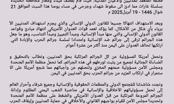 ندين ونستنكر بأشد العبارات استمرار جرائم العدوان الأمريكي بحق الشعب اليمني من خلال قصفه المتعمد للمدنيين والأعيان المدنية، حيث قام بقصف ميناء ومطار محافظة الحديدة بسلسلة غارات مما ادئ الى سقوط شهداء وجرحى في مساء يومنا هذا السبت الموافق 21 شوال 1446 – 19 أبريل 2025م