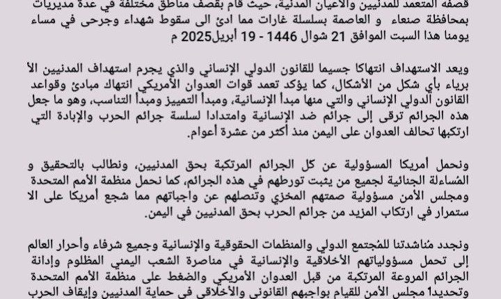 ندين ونستنكر بأشد العبارات استمرار جرائم العدوان الأمريكي بحق الشعب اليمني من خلال قصفه المتعمد للمدنيين والأعيان المدنية، حيث قام بقصف مناطق مختلفة في عدة مديريات بمحافظة صنعاء و العاصمة بسلسلة غارات مما ادئ الى سقوط شهداء وجرحى في مساء يومنا هذا السبت الموافق 21 شوال 1446 – 19 أبريل 2025م