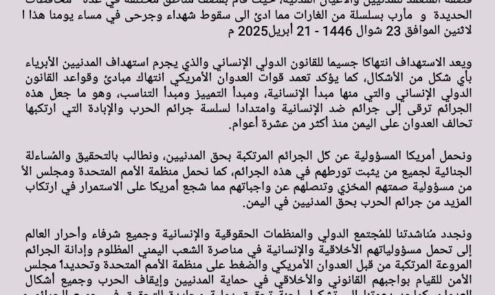 ندين ونستنكر بأشد العبارات استمرار جرائم العدوان الأمريكي بحق الشعب اليمني من خلال قصفه المتعمد للمدنيين والأعيان المدنية، حيث قام بقصف مناطق مختلفة في عدة محافظات الحديدة و مأرب بسلسلة من الغارات مما ادئ الى سقوط شهداء وجرحى في مساء يومنا هذا الاثنين الموافق 23 شوال 1446 – 21 أبريل 2025م