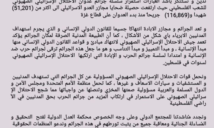 ندين و نستنكر بأشد العبارات استمرار سلسلة جرائم عدوان الاحتلال الإسرائيلي الصهيوني للشعب الفلسطيني حيث ارتفعت حصيلة ضحايا مجازر العدو الاسرائيلي الى اكثر من (51,201) شهيدا و (116,869) جريحاً منذ بدء العدوان على قطاع غزة