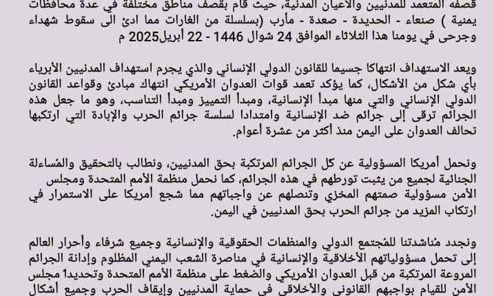ندين ونستنكر بأشد العبارات استمرار جرائم العدوان الأمريكي بحق الشعب اليمني من خلال قصفه المتعمد للمدنيين والأعيان المدنية، حيث قام بقصف مناطق مختلفة في عدة محافظات يمنية ( صنعاء – الحديدة – صعدة – مأرب) بسلسلة من الغارات مما ادئ الى سقوط شهداء وجرحى في يومنا هذا الثلاثاء الموافق 24 شوال 1446 – 22 أبريل 2025م