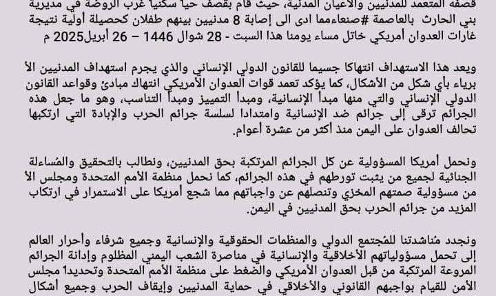 🇾🇪 عاجل | بيان إدانة منظمة انتصاف جريمة استهداف العدوان الأمريكي على حياً سكنياً غرب الروضة في مديرية #بني_الحارث بالعاصمة #صنعاء
