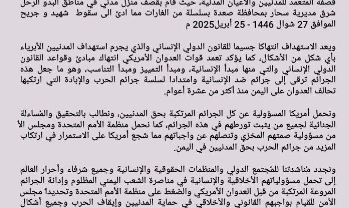 ندين ونستنكر بأشد العبارات استمرار جرائم العدوان الأمريكي بحق الشعب اليمني من خلال قصفه المتعمد للمدنيين والأعيان المدنية، حيث قام بقصف منزل مدني في مناطق البدو الرحل شرق مديرية سحار بمحافظة صعدة بسلسلة من الغارات مما ادئ الى سقوط شهيد و جريح الموافق 27 شوال 1446 – 25 أبريل 2025م