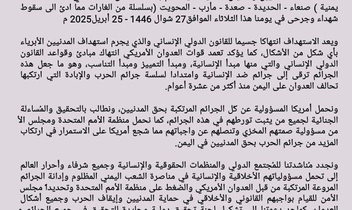 ندين ونستنكر بأشد العبارات استمرار جرائم العدوان الأمريكي بحق الشعب اليمني من خلال قصفه المتعمد للمدنيين والأعيان المدنية، حيث قام بقصف مناطق مختلفة في عدة محافظات يمنية ( صنعاء – الحديدة – صعدة – مأرب – المحويت) بسلسلة من الغارات مما ادئ الى سقوط شهداء وجرحى في يومنا هذا الثلاثاء الموافق 27شوال 1446 – 25 أبريل 2025م