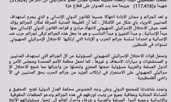 ندين و نستنكر بأشد العبارات استمرار سلسلة جرائم عدوان الاحتلال الإسرائيلي الصهيوني للشعب الفلسطيني حيث ارتفعت حصيلة ضحايا مجازر العدو الاسرائيلي الى اكثر من (51,439) شهيدا و (117,416) جريحاً منذ بدء العدوان على قطاع غزة