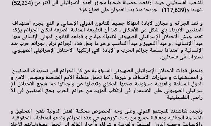 ندين و نستنكر بأشد العبارات استمرار سلسلة جرائم عدوان الاحتلال الإسرائيلي الصهيوني للشعب الفلسطيني حيث ارتفعت حصيلة ضحايا مجازر العدو الاسرائيلي الى اكثر من (52,243) شهيدا و (117,639) جريحاً منذ بدء العدوان على قطاع غزة