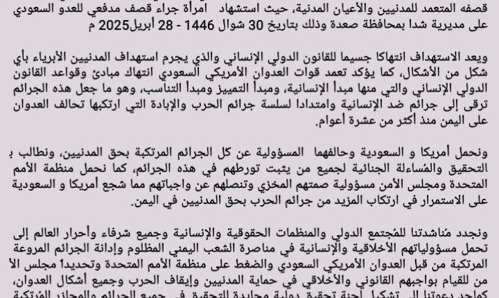 ندين ونستنكر بأشد العبارات استمرار جرائم العدوان الأمريكي السعودي بحق الشعب اليمني من خلال قصفه المتعمد للمدنيين والأعيان المدنية، حيث استشهاد امرأة جراء قصف مدفعي للعدو السعودي على مديرية شدا بمحافظة صعدة وذلك بتاريخ 30 شوال 1446 – 28 أبريل 2025م