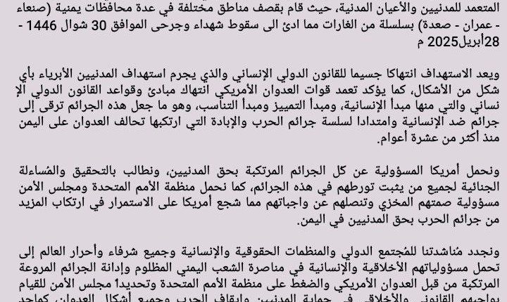 ندين ونستنكر بأشد العبارات استمرار جرائم العدوان الأمريكي بحق الشعب اليمني من خلال قصفه المتعمد للمدنيين والأعيان المدنية، حيث قام بقصف مناطق مختلفة في عدة محافظات يمنية ( صنعاء – عمران – صعدة ) بسلسلة من الغارات مما ادئ الى سقوط شهداء وجرحى الموافق 30 شوال 1446 – 28 أبريل 2025م