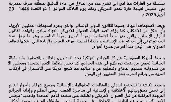 ندين ونستنكر بأشد العبارات استمرار جرائم العدوان الأمريكي بحق الشعب اليمني من خلال قصفه المتعمد للمدنيين والأعيان المدنية، حيث قام بقصف مناطق مختلفة في محافظة صنعاء بسلسلة من الغارات مما ادئ الى تضرر عدد من المنازل في حارة الدقيق بمنطقة صرف بمديرية بني حشيش نتيجة غارة للعدو الأمريكي وذلك يوم الثلاثاء الموافق 1 ذو القعدة 1446 – 29 أبريل 2025م