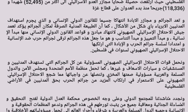 ندين و نستنكر بأشد العبارات استمرار سلسلة جرائم عدوان الاحتلال الإسرائيلي الصهيوني للشعب الفلسطيني حيث ارتفعت حصيلة ضحايا مجازر العدو الاسرائيلي الى اكثر من (52,418) شهيدا و (118,091)  جريحاً منذ بدء العدوان على قطاع غزة