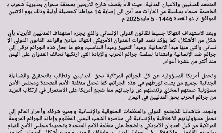 ندين ونستنكر بأشد العبارات استمرار جرائم العدوان الأمريكي بحق الشعب اليمني من خلال قصفه المتعمد للمدنيين والأعيان المدنية، حيث قام بقصف شارع الاربعين بمنطقة سعوان بمديرية شعوب بالعاصمة صنعاء بسلسلة من الغارات مما أدى الى إصابة 14 مواطنا كحصيلة أولية وذلك يوم الاثنين الموافق 7 ذو القعدة 1446 – 5 مايو 2025م