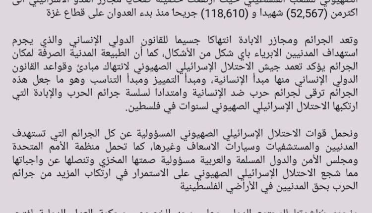 ندين و نستنكر بأشد العبارات استمرار سلسلة جرائم عدوان الاحتلال الإسرائيلي الصهيوني للشعب الفلسطيني حيث ارتفعت حصيلة ضحايا مجازر العدو الاسرائيلي الى اكثر من (52,567) شهيدا و (118,610) جريحاً منذ بدء العدوان على قطاع غزة