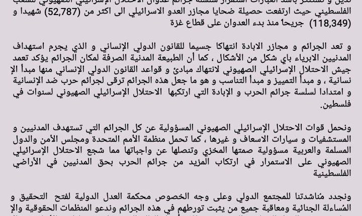 ندين و نستنكر بأشد العبارات استمرار سلسلة جرائم عدوان الاحتلال الإسرائيلي الصهيوني للشعب الفلسطيني حيث ارتفعت حصيلة ضحايا مجازر العدو الاسرائيلي الى اكثر من (52,787) شهيدا و (118,349) جريحاً منذ بدء العدوان على قطاع غزة