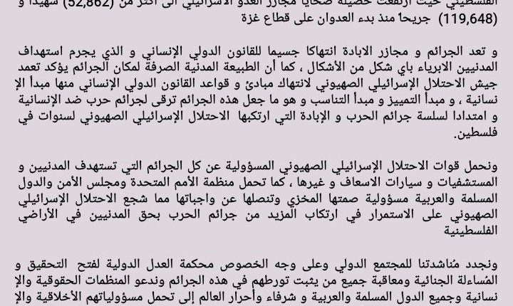 ندين و نستنكر بأشد العبارات استمرار سلسلة جرائم عدوان الاحتلال الإسرائيلي الصهيوني للشعب الفلسطيني حيث ارتفعت حصيلة ضحايا مجازر العدو الاسرائيلي الى اكثر من (52,862) شهيدا و (119,648) جريحاً منذ بدء العدوان على قطاع غزة