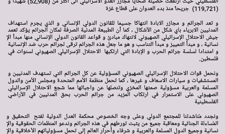ندين و نستنكر بأشد العبارات استمرار سلسلة جرائم عدوان الاحتلال الإسرائيلي الصهيوني للشعب الفلسطيني حيث ارتفعت حصيلة ضحايا مجازر العدو الاسرائيلي الى اكثر من (52,908) شهيدا و (119,721) جريحاً منذ بدء العدوان على قطاع غزة