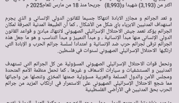 ندين و نستنكر بأشد العبارات استمرار سلسلة جرائم عدوان الاحتلال الإسرائيلي الصهيوني للشعب الفلسطيني حيث ارتفعت حصيلة ضحايا مجازر العدو الاسرائيلي الى اكثر من (3,193) شهيدا و (8,993) جريحاً منذ 18 من مارس للعام 2025م