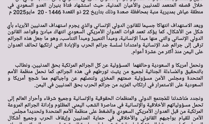 ندين ونستنكر بأشد العبارات استمرار جرائم العدوان الأمريكي السعودي بحق الشعب اليمني من خلال قصفه المتعمد للمدنيين والأعيان المدنية، حيث استشهاد فتاة بنيران العدو السعودي في منطقة عياش بمديرية منبة بمحافظة صعدة وذلك بتاريخ 22 ذو القعدة 1446 – 20 مايو 2025م