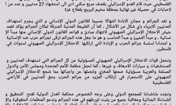 ندين و نستنكر بأشد العبارات استمرار سلسلة جرائم عدوان الاحتلال الإسرائيلي الصهيوني للشعب الفلسطيني حيث قام العدو الإسرائيلي بقصف مربع سكني ادى الى استشهاد 27 مدنيين و عدد من الاصابات في حصيلة غير نهائية بمنطقة مخيم البريج بقطاع غزة