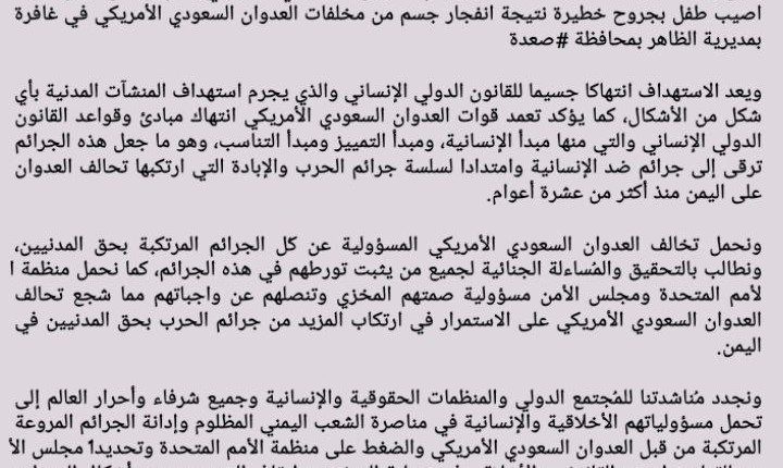 ندين ونستنكر بأشد العبارات استمرار جرائم العدوان السعودي الأمريكي بحق أطفال اليمن حيث اصيب طفل بجروح خطيرة نتيجة انفجار جسم من مخلفات العدوان السعودي الأمريكي في غافرة بمديرية الظاهر بمحافظة #صعدة