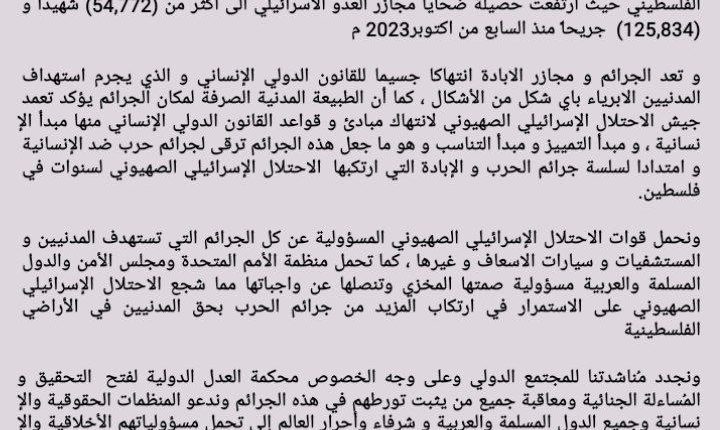 ندين و نستنكر بأشد العبارات استمرار سلسلة جرائم عدوان الاحتلال الإسرائيلي الصهيوني للشعب الفلسطيني حيث ارتفعت حصيلة ضحايا مجازر العدو الاسرائيلي الى اكثر من (54,772) شهيدا و (125,834) جريحاً منذ السابع من اكتوبر 2023م