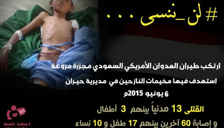 #لن_ننسى أرتكب طيران العدوان الأمريكي السعودي مجزرة مروعة استهدف فيها مخيمات النازحين في مديرية حيران 6 يونيو ٢٠١٥م