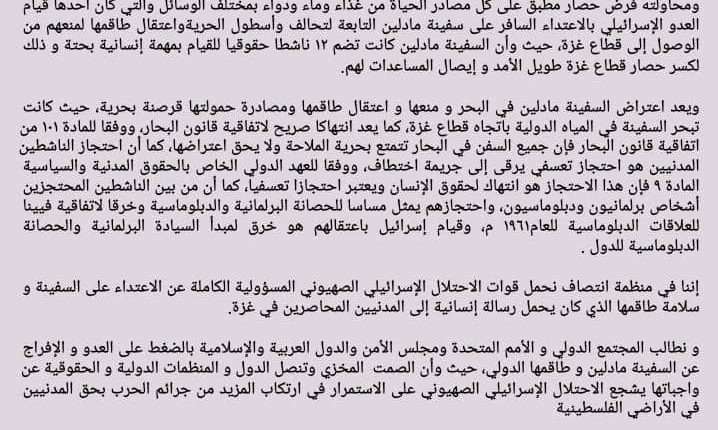 ندين و نستنكر بأشد العبارات استمرار سلسلة جرائم عدوان الاحتلال الإسرائيلي الصهيوني للشعب الفلسطيني ومحاولته فرض حصار مطبق على كل مصادر الحياة من غذاء وماء ودواء بمختلف الوسائل والتي كان أحدها قيام العدو الإسرائيلي بالاعتداء السافر على سفينة مادلين التابعة لتحالف وأسطول الحريةواعتقال طاقمها لمنعهم من الوصول إلى قطاع غزة، حيث وأن السفينة مادلين كانت تضم ١٢ ناشطا حقوقيا للقيام بمهمة إنسانية بحتة و ذلك لكسر حصار قطاع غزة طويل الأمد و إيصال المساعدات لهم.