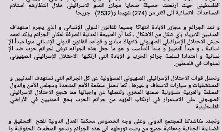 ونجدد مُناشدتنا للمجتمع الدولي وعلى وجه الخصوص محكمة العدل الدولية لفتح التحقيق والمُساءلة الجنائية ومعاقبة جميع من يثبت تورطهم في هذه الجرائم وندعو المنظمات الحقوقية والإنسانية وجميع الدول المسلمة والعربية و شرفاء وأحرار العالم إلى تحمل مسؤولياتهم الأخلاقية والإنسانية في مناصرة الشعب الفلسطيني المظلوم وإدانة الجرائم المروعة المرتكبة من قبل الاحتلال الإسرائيلي الصهيوني والضغط على منظمة الأمم المتحدة وتحديداً مجلس الأمن للقيام بواجبهم القانوني والأخلاقي في حماية المدنيين وإيقاف هذا العدوان المتعمد