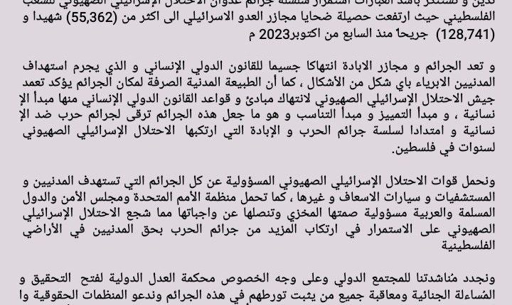 ندين و نستنكر بأشد العبارات استمرار سلسلة جرائم عدوان الاحتلال الإسرائيلي الصهيوني للشعب الفلسطيني حيث ارتفعت حصيلة ضحايا مجازر العدو الاسرائيلي الى اكثر من (55,362) شهيدا و (128,741) جريحاً منذ السابع من اكتوبر 2023م