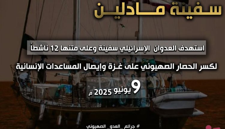 سفينة مادلين استهدف العدوان الإسرائيلي سفينة وعلى متنها 12 ناشطاً لكسر الحصار الصهيوني على غزة و ايصال المساعدات الإنسانية