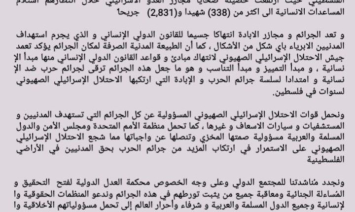 ونجدد مُناشدتنا للمجتمع الدولي وعلى وجه الخصوص محكمة العدل الدولية لفتح التحقيق والمُساءلة الجنائية ومعاقبة جميع من يثبت تورطهم في هذه الجرائم وندعو المنظمات الحقوقية والإنسانية وجميع الدول المسلمة والعربية و شرفاء وأحرار العالم إلى تحمل مسؤولياتهم الأخلاقية والإنسانية في مناصرة الشعب الفلسطيني المظلوم وإدانة الجرائم المروعة المرتكبة من قبل الاحتلال الإسرائيلي الصهيوني والضغط على منظمة الأمم المتحدة وتحديداً مجلس الأمن للقيام بواجبهم القانوني والأخلاقي في حماية المدنيين وإيقاف هذا العدوان المتعمد