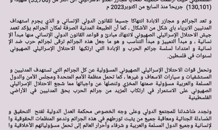 ندين و نستنكر بأشد العبارات استمرار سلسلة جرائم عدوان الاحتلال الإسرائيلي الصهيوني للشعب الفلسطيني حيث ارتفعت حصيلة ضحايا مجازر العدو الاسرائيلي الى اكثر من (55,706) شهيدا و (130,101) جريحاً منذ السابع من اكتوبر 2023م