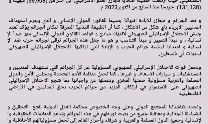 ندين و نستنكر بأشد العبارات استمرار سلسلة جرائم عدوان الاحتلال الإسرائيلي الصهيوني للشعب الفلسطيني حيث ارتفعت حصيلة ضحايا مجازر العدو الاسرائيلي الى اكثر من (55,908) شهيدا و (131,138) جريحاً منذ السابع من اكتوبر 2023م