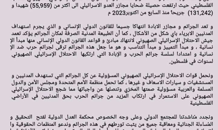 ندين و نستنكر بأشد العبارات استمرار سلسلة جرائم عدوان الاحتلال الإسرائيلي الصهيوني للشعب الفلسطيني حيث ارتفعت حصيلة ضحايا مجازر العدو الاسرائيلي الى اكثر من (55,959) شهيدا و (131,242) جريحاً منذ السابع من اكتوبر 2023م
