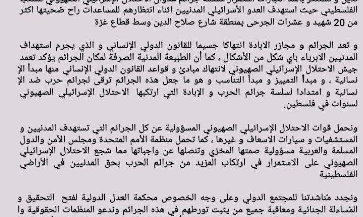 ندين و نستنكر بأشد العبارات استمرار سلسلة جرائم عدوان الاحتلال الإسرائيلي الصهيوني للشعب الفلسطيني حيث استهدف العدو الأسرائيلي المدنيين اثناء انتظارهم للمساعدات راح ضحيتها اكثر من 20 شهيد و عشرات الجرحى بمنطقة شارع صلاح الدين وسط قطاع غزة