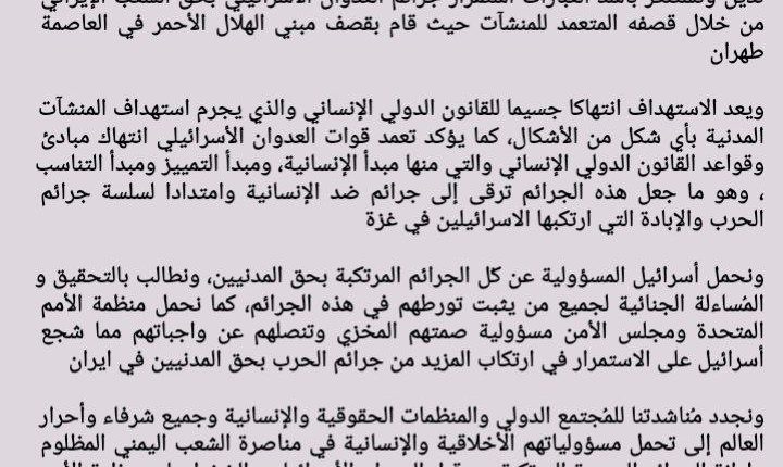 ندين ونستنكر بأشد العبارات استمرار جرائم العدوان الأسرائيلي بحق الشعب الإيراني من خلال قصفه المتعمد للمنشآت حيث قام بقصف مبني الهلال الأحمر في العاصمة طهران