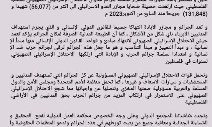 ندين و نستنكر بأشد العبارات استمرار سلسلة جرائم عدوان الاحتلال الإسرائيلي الصهيوني للشعب الفلسطيني حيث ارتفعت حصيلة ضحايا مجازر العدو الاسرائيلي الى اكثر من (56,077) شهيدا و (131,848) جريحاً منذ السابع من اكتوبر 2023م