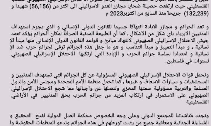 ندين و نستنكر بأشد العبارات استمرار سلسلة جرائم عدوان الاحتلال الإسرائيلي الصهيوني للشعب الفلسطيني حيث ارتفعت حصيلة ضحايا مجازر العدو الاسرائيلي الى اكثر من (56,156) شهيدا و (132,239) جريحاً منذ السابع من اكتوبر 2023م