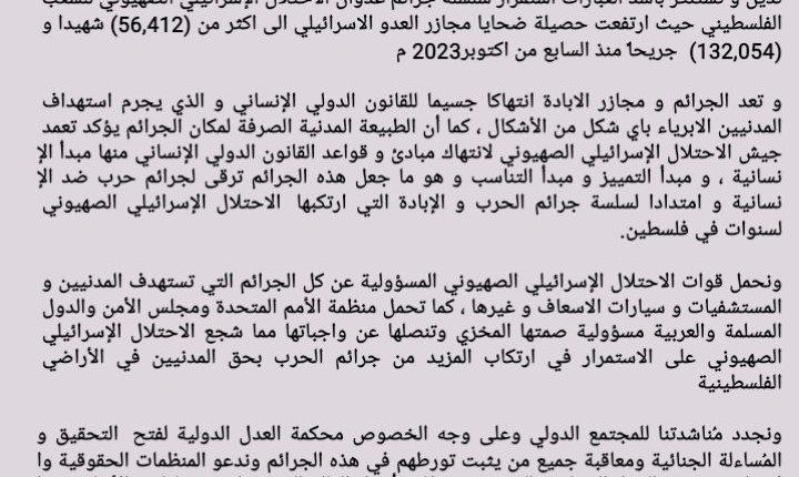 ندين و نستنكر بأشد العبارات استمرار سلسلة جرائم عدوان الاحتلال الإسرائيلي الصهيوني للشعب الفلسطيني حيث ارتفعت حصيلة ضحايا مجازر العدو الاسرائيلي الى اكثر من (56,412) شهيدا و (132,054) جريحاً منذ السابع من اكتوبر 2023م