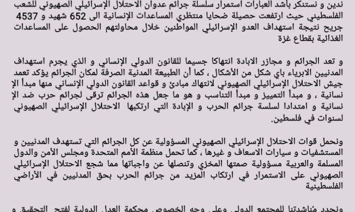 ندين و نستنكر بأشد العبارات استمرار سلسلة جرائم عدوان الاحتلال الإسرائيلي الصهيوني للشعب الفلسطيني حيث ارتفعت حصيلة ضحايا منتظري المساعدات الإنسانية الى 652 شهيد و 4537 جريح نتيجة استهداف العدو الإسرائيلي المواطنين خلال محاولتهم الحصول على المساعدات الغذائية بقطاع غزة