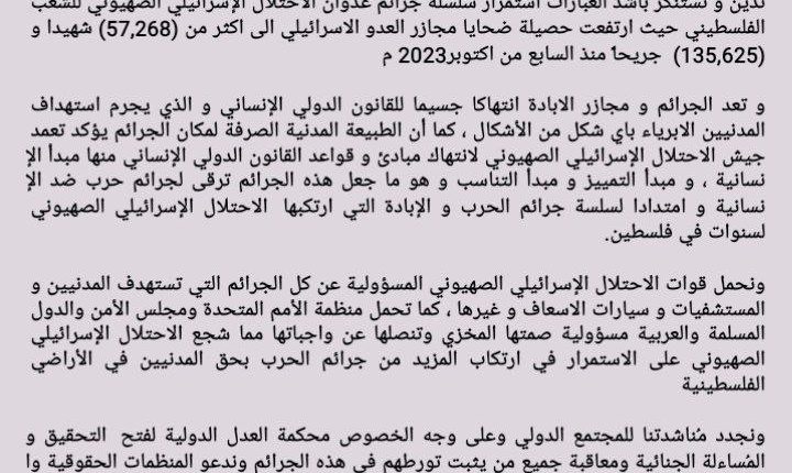 ندين و نستنكر بأشد العبارات استمرار سلسلة جرائم عدوان الاحتلال الإسرائيلي الصهيوني للشعب الفلسطيني حيث ارتفعت حصيلة ضحايا مجازر العدو الاسرائيلي الى اكثر من (57,268) شهيدا و (135,625)  جريحاً منذ السابع من اكتوبر 2023م
