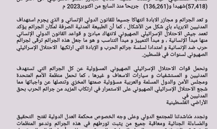ندين و نستنكر بأشد العبارات استمرار سلسلة جرائم عدوان الاحتلال الإسرائيلي الصهيوني للشعب الفلسطيني حيث ارتفعت حصيلة ضحايا مجازر العدو الاسرائيلي الى اكثر من (57,418) شهيدا و (136,261) جريحاً منذ السابع من اكتوبر 2023م