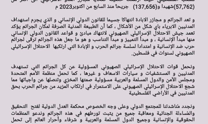 ندين و نستنكر بأشد العبارات استمرار سلسلة جرائم عدوان الاحتلال الإسرائيلي الصهيوني للشعب الفلسطيني حيث ارتفعت حصيلة ضحايا مجازر العدو الاسرائيلي الى اكثر من (57,762) شهيدا و (137,656)  جريحاً منذ السابع من اكتوبر 2023م