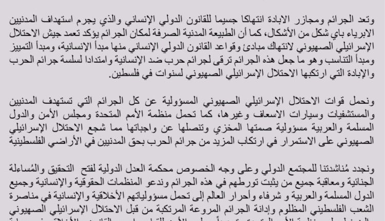 ونجدد مُناشدتنا للمجتمع الدولي وعلى وجه الخصوص محكمة العدل الدولية لفتح التحقيق والمُساءلة الجنائية ومعاقبة جميع من يثبت تورطهم في هذه الجرائم وندعو المنظمات الحقوقية والإنسانية وجميع الدول المسلمة والعربية و شرفاء وأحرار العالم إلى تحمل مسؤولياتهم الأخلاقية والإنسانية في مناصرة الشعب الفلسطيني المظلوم وإدانة الجرائم المروعة المرتكبة من قبل الاحتلال الإسرائيلي الصهيوني والضغط على منظمة الأمم المتحدة وتحديداً مجلس الأمن للقيام بواجبهم القانون والأخلاقي في حماية المدنيين وإيقاف هذا العدوان المتعمد