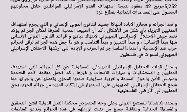 ندين و نستنكر بأشد العبارات استمرار سلسلة جرائم عدوان الاحتلال الإسرائيلي الصهيوني للشعب الفلسطيني حيث ارتفعت حصيلة ضحايا منتظري المساعدات الإنسانية الى 805 شهيد و 5,252 جريح 42 مفقود نتيجة استهداف العدو الإسرائيلي المواطنين خلال محاولتهم الحصول على المساعدات الغذائية بقطاع غزة