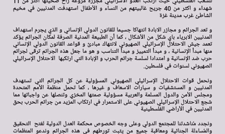 ندين و نستنكر بأشد العبارات استمرار سلسلة جرائم عدوان الاحتلال الإسرائيلي الصهيوني للشعب الفلسطيني حيث ارتكب العدو الاسرائيلي مجزرة مروعة راح ضحيتها أكثر من 11 شهداء و اكثر من 40 جريح غالبيتهم من النساء و الأطفال استهدفت المدنيين في مخيم الشاطئ غرب مدينة غزة