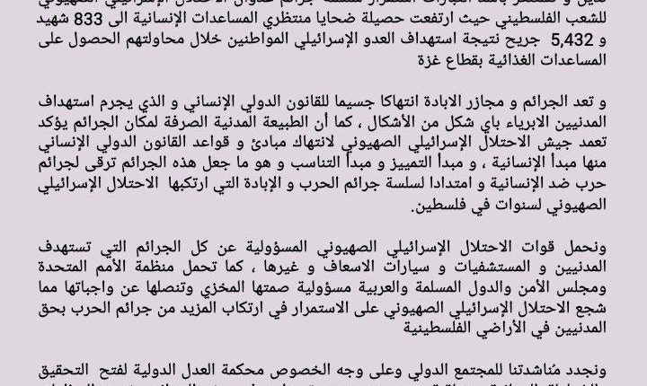 ندين و نستنكر بأشد العبارات استمرار سلسلة جرائم عدوان الاحتلال الإسرائيلي الصهيوني للشعب الفلسطيني حيث ارتفعت حصيلة ضحايا منتظري المساعدات الإنسانية الى 833 شهيد و 5,432 جريح نتيجة استهداف العدو الإسرائيلي المواطنين خلال محاولتهم الحصول على المساعدات الغذائية بقطاع غزة